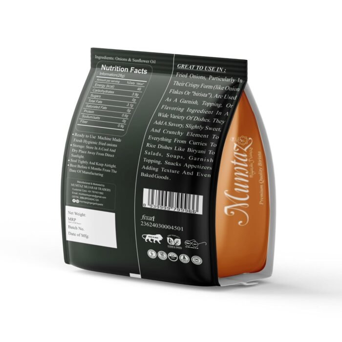 Mumtaz Mujarab Traders Golden Fried Onion Pack of 1 in Flakes Birista Fried Pyaz Used for Biryani,gravies, Indian Curries No Artificial Preservatives & Flavouring Ready to Use 500g PREMIUM QUALITY BIRISTA ONIONS: Made from the finest grade dehydrated onion flakes, Golden Fried Onions provide rich flavor and crispy texture for all your cooking needs. VERSATILE GARNISH FOR INDIAN & ASIAN CUISINE: Perfect for garnishing biryanis, pulaos, curries, gravies, soups, and other Indian and Southeast Asian dishes—enhance the taste and texture with ease. IDEAL FOR CHINESE & PUNJABI GRAVIES: Bring extra flavor and crunch to your favorite Chinese, Punjabi, and Indian gravies, making them even more delicious and appealing. TIME-SAVING & EASY TO USE: Ready-to-use straight from the pack, Golden Fried Onions save you time in the kitchen without compromising on flavor or quality. CONVENIENT STORAGE: Once opened, store in an air-tight container to preserve freshness and ensure the crispy texture lasts longer.